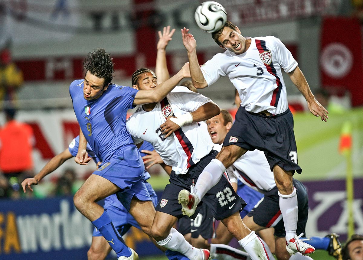 Fussball WM 2006 Gruppenspiel Vorrunde 17.06.2006 Gruppe C USA -Italien Luca Toni (ITA)li, Oguchi Onyewu (USA) mitte, Carlos Bocanegra (USA) re FOTO: Pressefoto ULMER/Johannes Kernmayer